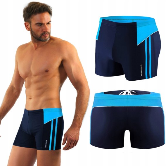 Przylegające do ciała kąpielówki męskie w głębokim granatowym kolorze z niebieskimi dodatkami to idealna propozycja na atrakcyjny strój zarówno na basen, jak i na plażę.
