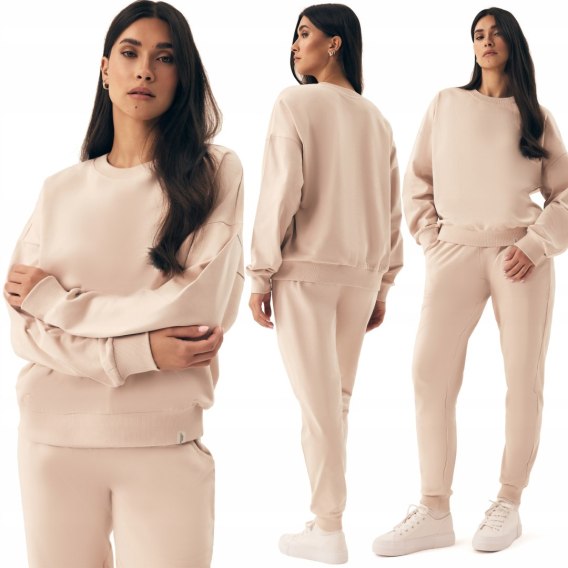☑️ Luźna bluza: Góra kompletu to dresowa bluza typu oversize w kremowym kolorze.