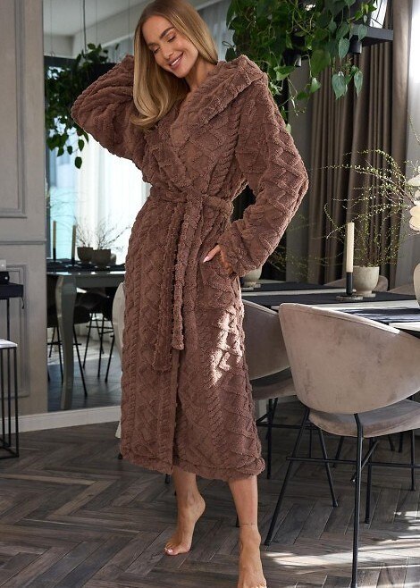 Długi szlafrok damski z kapturem z miękkiej dzianiny z wytłaczanym, wypukłym, grubym wzorem. Długi rękaw, wiązany w pasie. Po bokach dwie zewnętrzne kieszenie. Skład: 100% poliester.