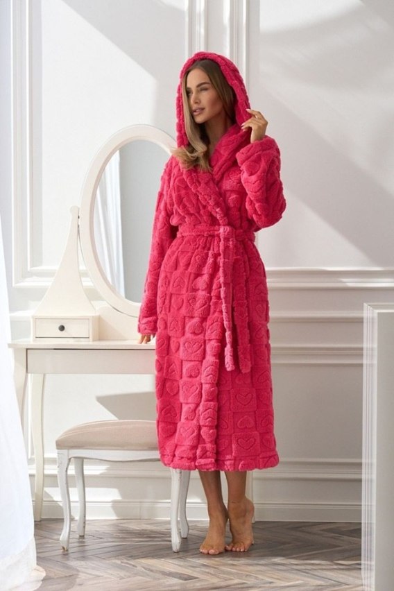 Długi szlafrok damski z miękkiej, ciepłej dzianiny ozdobionej wytłaczanym, wypukłym wzorem w serca. Posiada wiązanie w pasie, długi rękaw, kaptur i wygodne kieszenie na biodrach. Skład: 100% poliester.
