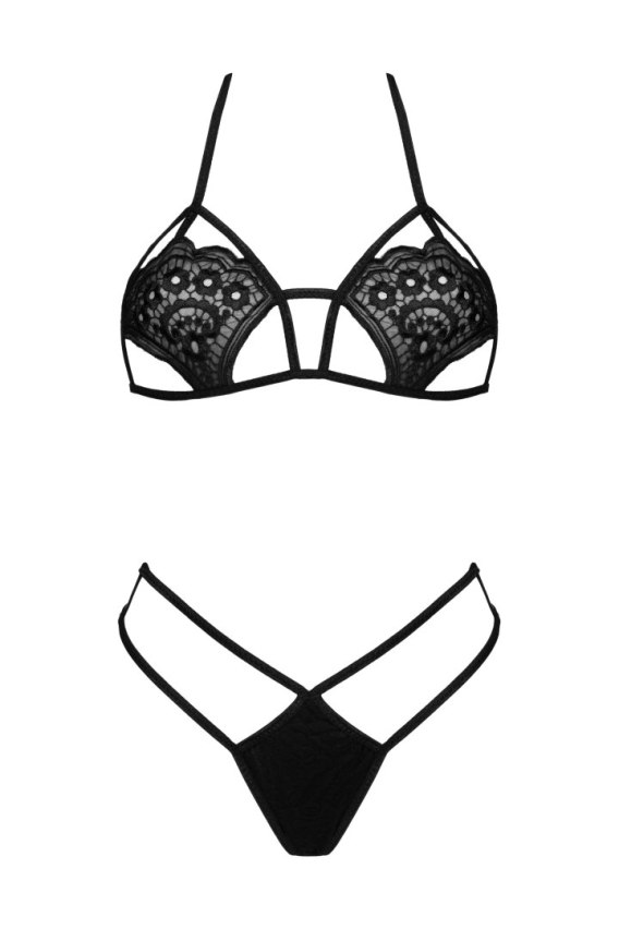 Nietypowy, pikantny komplet Jimena składa się ze stanika i dopasowanych stylem majteczek typu stringi. Czarne tasiemki dodatkowo podkreślają jego uwodzicielski charakter.