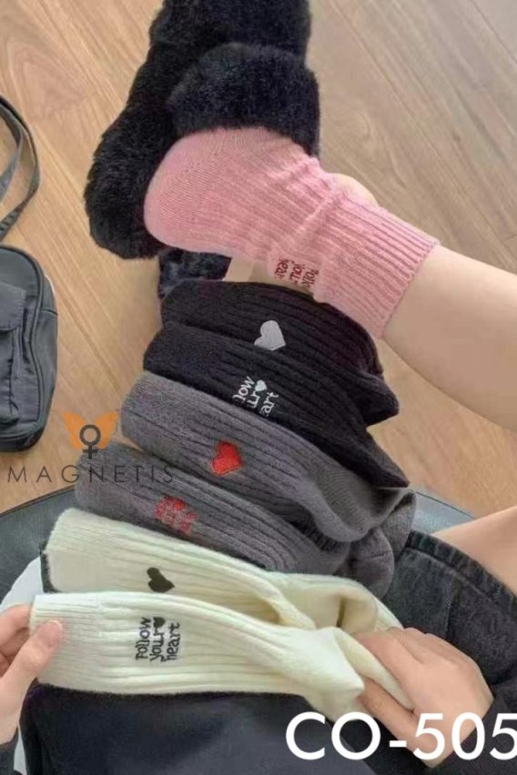 Skarpetki MAGNETIS CO-5057 to połączenie przytulnego komfortu i modnego designu w codziennym wydaniu. Wykonane z miękkiej dzianiny z wysoką zawartością wełny, gwarantują ciepło i wygodę przez cały dzień. Ich charakterystycznym elementem jest subtelna aplikacja w postaci napisu „Follow your heart” oraz serduszka, które dodają im uroku i wyjątkowego stylu. Dostępne w kilku modnych kolorach – od delikatnego różu po klasyczną czerń – stanowią idealne uzupełnienie każdej casualowej stylizacji. Doskonałe do noszenia w domu, z botkami lub sneakersami – zawsze z nutą przyjemnego ciepła i pozytywnej energii.