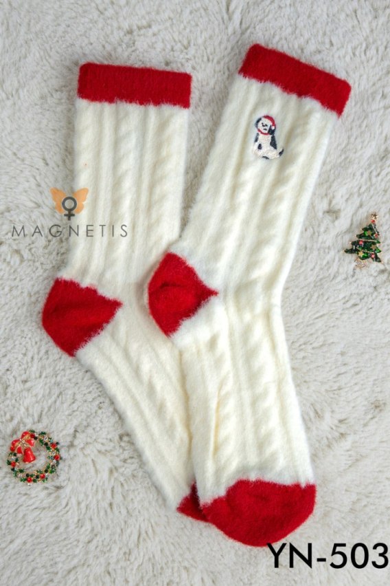 Skarpetki świąteczne Magnetis YN-5034 „Piesek” to idealny wybór na zimowe wieczory pełne ciepła i radości. Wykonane z miękkiej, przyjemnej w dotyku dzianiny z wysoką zawartością wiskozy, gwarantują komfort i ciepło w każdy chłodny dzień. Uroczy motyw pieska w czapeczce świątecznej oraz kontrastowe czerwone wykończenia dodają im wyjątkowego, bożonarodzeniowego charakteru. Idealne jako prezent, drobny upominek lub po prostu uroczy dodatek do zimowej stylizacji.