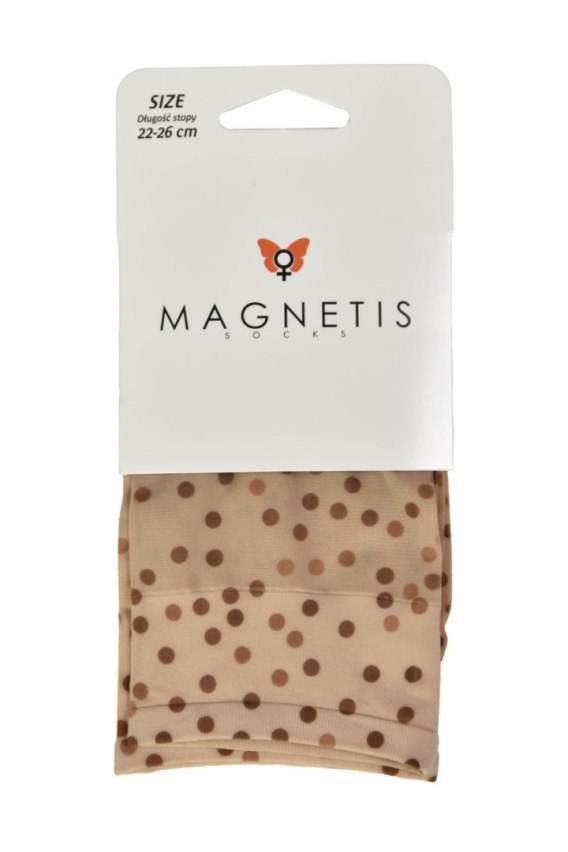 Stylowe i kobiece rajstopy Magnetis 15 DEN z uroczym wzorem brązowych groszków to doskonały wybór dla pań, które cenią sobie modowe detale. Cienkie i subtelne, wykonane z trwałego poliamidu z dodatkiem elastanu, idealnie dopasowują się do nóg i zapewniają komfort przez cały dzień. Ich klasyczny beżowy kolor przełamany groszkowym motywem dodaje lekkości i dziewczęcego uroku każdej stylizacji – od biurowych zestawów po wieczorowe outfity.
