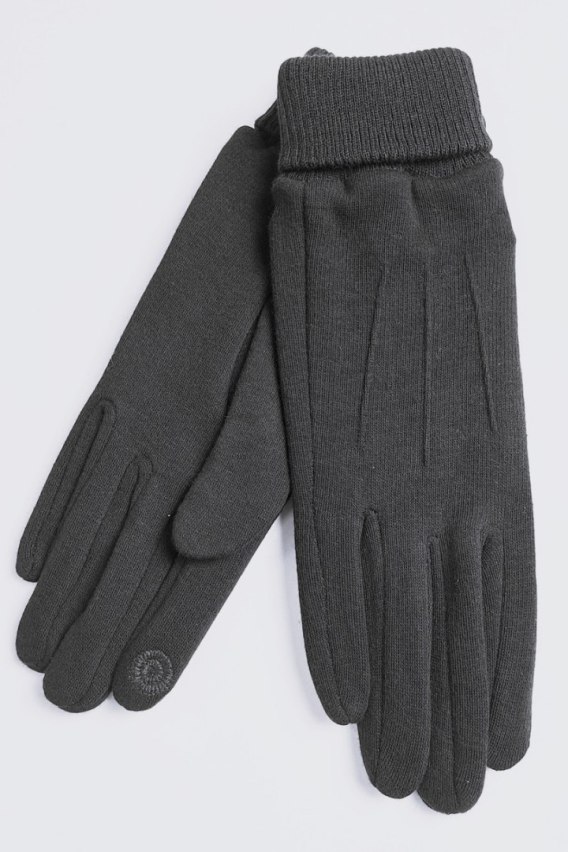 Rękawiczki damskie z przeszyciem. Uszyte z dzianiny, ze ściągaczowym mankietem, w środku miły, ocieplający meszek, ozdobione przeszyciem. Palec wskazujący i kciuk ma specjalne przeszycie pozwalające na obsługę telefonu bez konieczności zdejmowania rękawiczki.