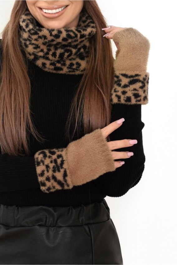 Eleganckie rękawiczki zimowe wykonane z miękkiej, przyjemnej w dotyku przędzy w modny wzór panterki. Pasują do czapki P-060, szalika P-059