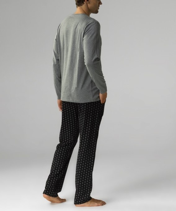 Piżama lekko ovrsize męska z miękkiej bawełny z efektem brzoskwini („peach effect"). Bluza z okrągłym wycięciem przy szyji, ściągacze przy rękawach. Spodnie luźne, we wzorek, posiadają kieszenie oraz ściągacze. Skład:100% bawełna.