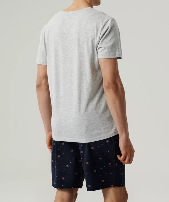 Bawełniana piżama o sportowym charakterze, która może być również zestawieniem na dzień. Koszulka gładka, luźna z okrągłym dekoltem. Spodenek ozdobione motywem koszykarskim. Skład:góra: 95% bawełna, 5% elastan, dół: 100% bawełna.