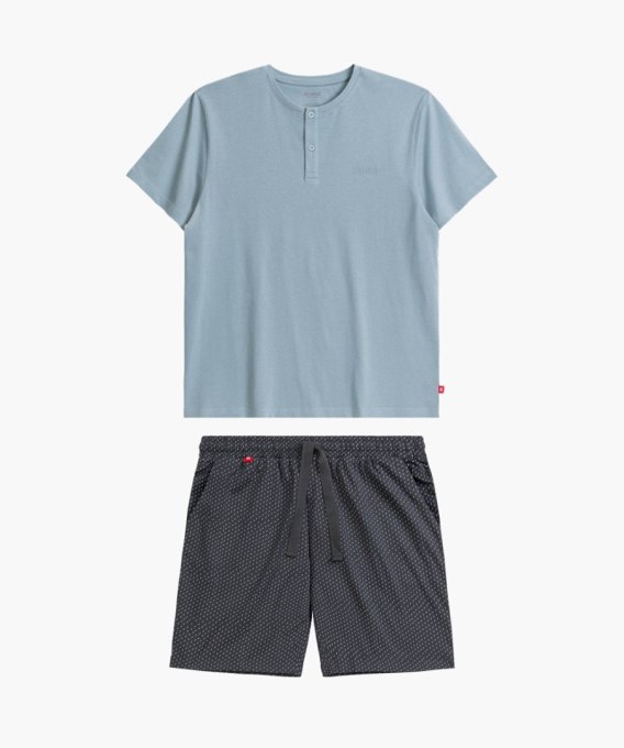 Piżama męska w skład której wchodzi gładki t-shirt oraz spodenki z księżycowym nadrukiem, wiązane na sznurek z wygodnymi i praktycznymi kieszeniami. Dzianina bawełniana o właściwościach higroskopijnych. Skład: 100% bawełna.