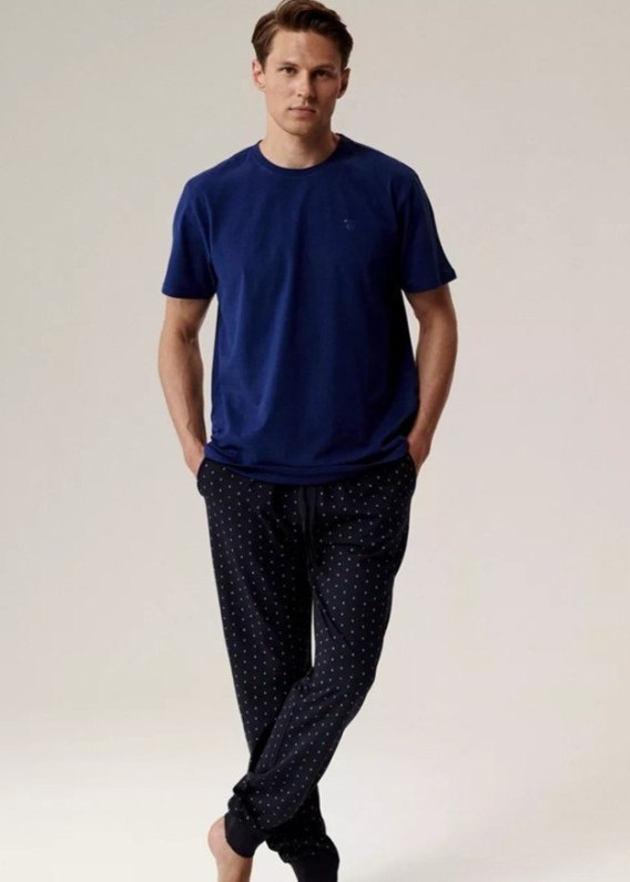 Piżama z przyjemnej w dotyku bawełny z efektem brzoskwini. Bluzka o luźnym kroju, z okrągłym dekoltem i krótkim rękawem. Spodnie wzorzyste z prostą nogawką zakończoną ściągaczem, troczek w talii oraz kieszenie po bokach. Skład: 100% bawełna.