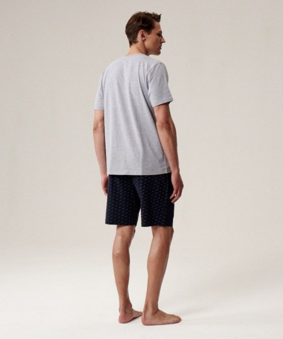 Piżama męska wykonana z bawełny z efektem brzoskwini, przewiewnej i przyjaznej dla skóry. Koszulka o luźnym kroju, krótkim rękawem i okrągłym dekoltem. Spodenki ze sznurkiem do regulacji i bocznymi kieszeniami. Skład: 100% bawełna.