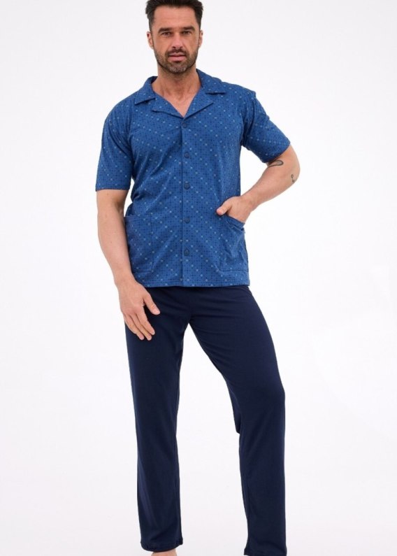 Piżama męska, rozpinana, uszyta z wysokiej jakość bawełny. Bluzka wzorzysta, z krótkim rękawem, kieszeniami i kołnierzykiem, zapinana na guziki. Spodnie długie, jednolite. Skład: 100% bawełna.