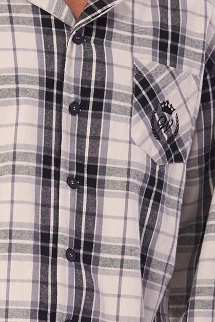 Piżama z miękkiej, ciepłej flaneli w kratę. Koszula z długim rękawem, kołnierzykiem, rozpinana. Spodnie z długą, prostą nogawką i praktycznymi kieszeniami po bokach. Skład: 100% bawełna.
