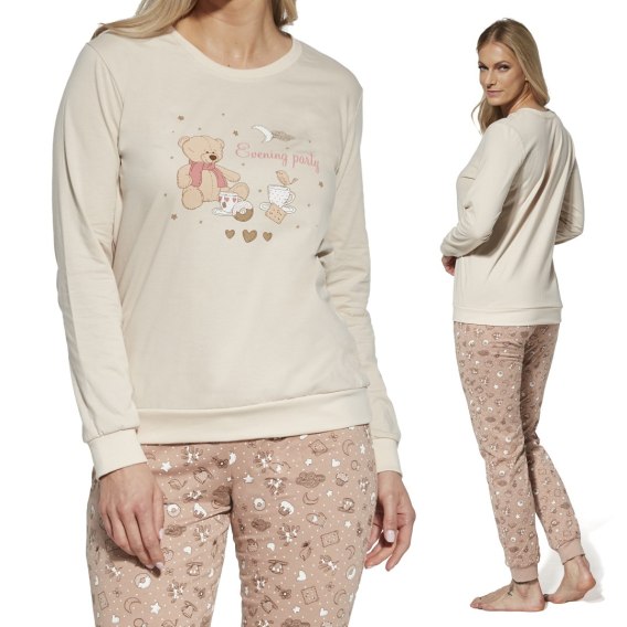 Komplet piżamowy Cornette Evening zawiera beżową piżamową bluzkę z nadrukiem wykończoną ściągaczami oraz ciemniejsze, wzorzyste, długie spodnie.
