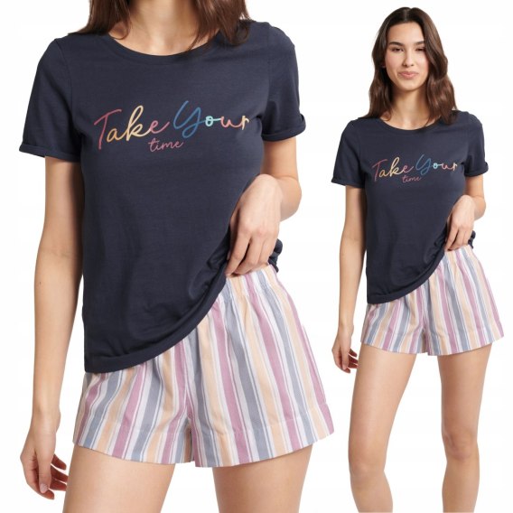 Komplet piżamowy składa się z granatowej bawełnianej koszulki oraz kolorowych spodenek w paski.