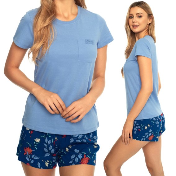Komplet piżamowy składa się z błękitnej bawełnianej bluzki z krótkim rękawkiem oraz wzorzystych spodenek z wiskozy.