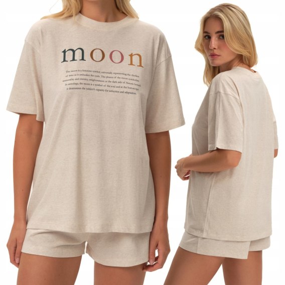 ⭐ Góra piżamy składa się z beżowej bluzki z charakterystycznym nadrukiem i luźnymi rękawami.