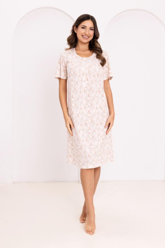 Wygodna koszula nocna damska o klasycznym, luźnym kroju, idealna dla kobiet ceniących komfort i swobodę. Jasna kolorystyka z subtelnym, drobnym motywem kwiatowym nadaje całości lekkości i ponadczasowej elegancji. Krótki rękaw oraz długość do kolan sprawiają, że koszula doskonale sprawdzi się zarówno latem, jak i przez cały rok. Delikatne marszczenie pod biustem zapewnia wygodne dopasowanie i nie krępuje ruchów, gwarantując komfort podczas snu i domowego wypoczynku.