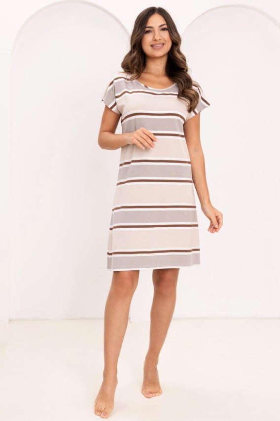 Komfortowa koszula nocna damska o nowoczesnym, prostym kroju, zaprojektowana z myślą o wygodzie i swobodzie ruchów. Wyrazisty wzór w poziome paski nadaje jej świeży, młodzieżowy charakter. Krótki rękaw oraz długość przed kolano sprawiają, że koszula doskonale sprawdzi się w sezonie wiosenno-letnim. Miękki, przyjemny w dotyku materiał zapewnia komfort noszenia zarówno podczas snu, jak i domowego relaksu.