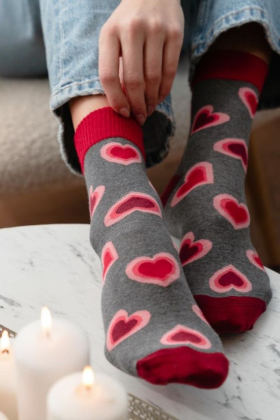 Z okazji święta Walentynek zaprojektowaliśmy zabawne skarpetki damskie z motywem serduszek. Atrakcyjne, bawełniane skarpety zostały wykonane z przędzy o najwyższej jakości. Subtelne zdobienia z łatwością można dopasować do każdej stylizacji, niezależnie od dominującej w niej kolorystyki. Skarpetki z motywem serc, są elementem garderoby, który wywoła uśmiech na twarzy każdej kobiety. Idealny pomysł na praktyczny, walentynkowy prezent.