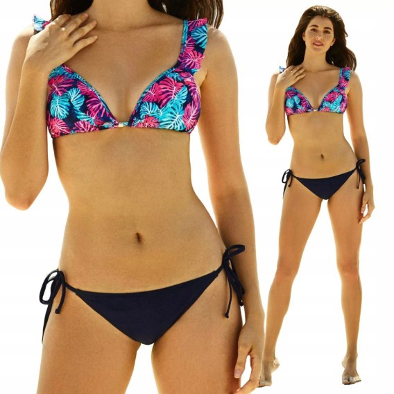 Kostium typu bikini. Biustonosz w subtelne kwiaty, miseczki podszyte delikatną gąbeczką, bez fiszbin, wiązany na szyi i plecach. Figi w jednolite w kolorze granat.