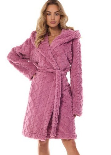 Krótki szlafrok z kapturem z miękkiej dzianiny z wytłaczanym, wypukłym wzorem. Rękaw długi, wiązany w pasie, dwie zewnętrzne wygodne kieszenie. Skład: 100% poliester.