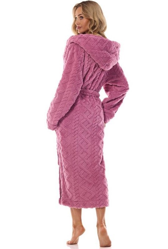 Szlafrok damski długi z kapturem z dzianiny typu super soft. Miękka dzianina z wytłaczanym wzorem. Wiązany w pasie, na wysokości bioder kieszenie.Skład: 100% poliester