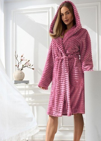 Krótki szlafrok damski z kapturem z miękkiej i ciepłej dzianiny tłoczonej w poziome, wypukłe pasy.Wiązany w pasie, wygode kieszenie po bokach i długi rękaw. Skład: 100% poliester.