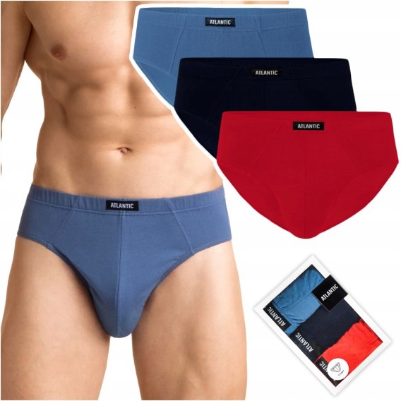 Atlantic 3MP-129 to trzypak slipów męskich w trzech kolorach: denimowym, granatowym oraz czerwonym. Slipy mają klasyczny charakter - odznaczają się średniej wysokości talią oraz dość mocno zabudowanymi bokami. W talii wykończone są miękką i niezwykle komfortową gumą wewnętrzną.