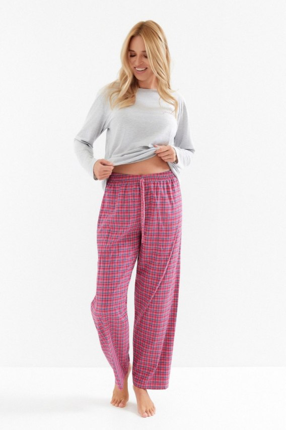 Piżama damska Madlen 3512 to klasyczna propozycja dla kobiet, które cenią sobie wygodę, miękkość i subtelny styl. Wykonana w 100% z delikatnej, naturalnej bawełny, gwarantuje komfort noszenia przez całą noc oraz doskonałą przewiewność. Góra o prostym kroju z długim rękawem i okrągłym dekoltem została ozdobiona delikatnym nadrukiem z przodu, który dodaje jej kobiecego uroku. Spodnie z długimi nogawkami w modną kratę tworzą gustowny komplet, idealny zarówno do snu, jak i domowego relaksu.