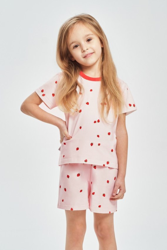Piżama składa się z koszulki z krótkim rękawem, ozdobionej radosnym nadrukiem w truskaweczki, który nadaje całości dziewczęcego uroku. Do kompletu dołączone są krótkie szorty, idealne na cieplejsze noce i letni wypoczynek. Lekki materiał zapewnia swobodę ruchów oraz komfort noszenia przez całą noc.