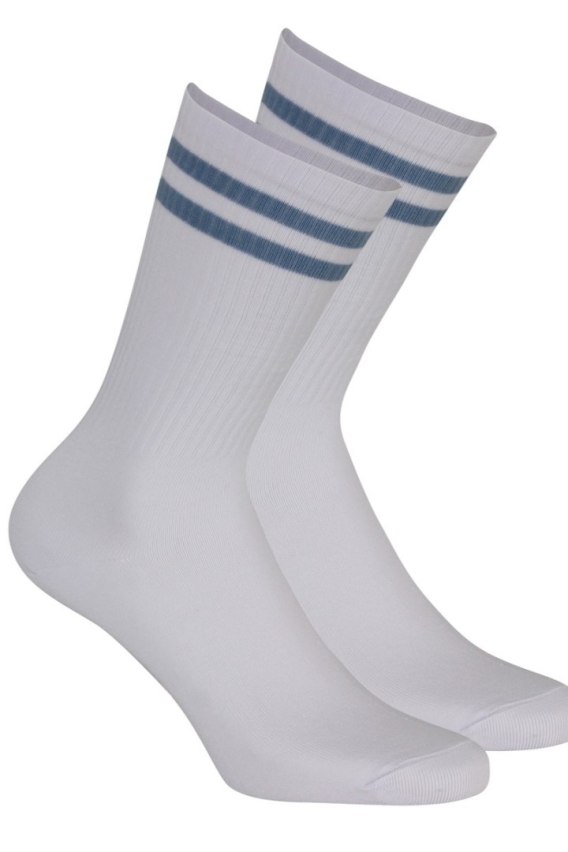 Skarpetki bawełniane gładkie z dwoma kolorowymi paskami . Skład surowcowy: 85 % Bawełna, 12% Poliamid, 3% Elastan.